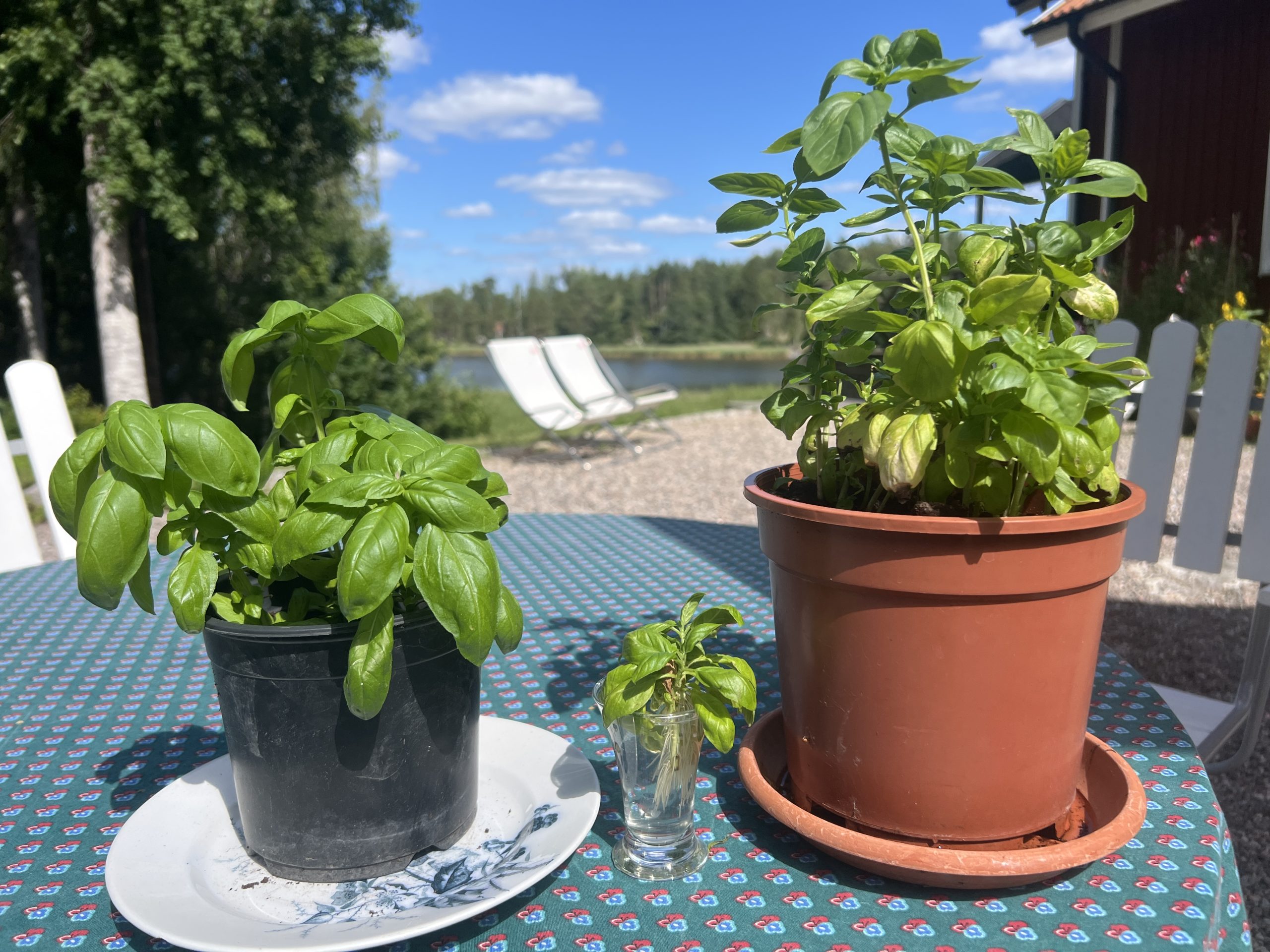 (svart kruka 10 dagar gamla planterade sticklingar, glas med nya sticklingar, brun kruka ursprungsplantan – en krukbasilika från butik som fått större kruka)
